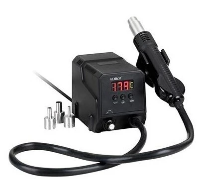 Cuenta con un display LCD donde muestra multiples parametros de trabajo, además dispone de controles separados para el ajuste del caudal de aire y de la temperatura. Incluye tres toberas de diferentes formatos para adaptarse a multiples componentes.
