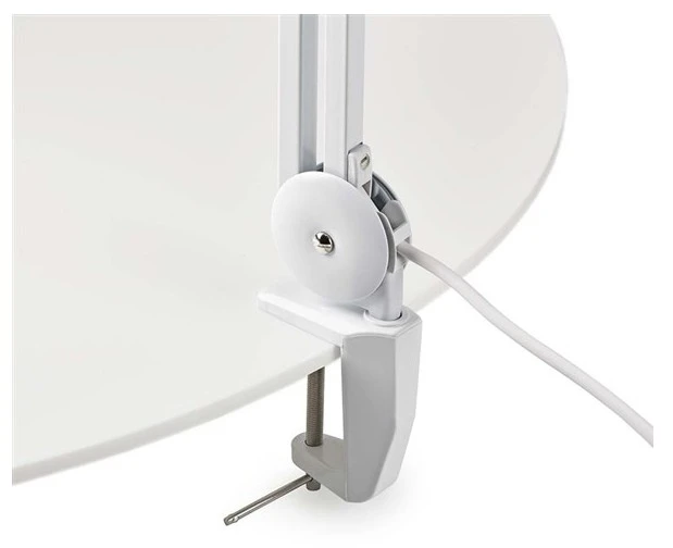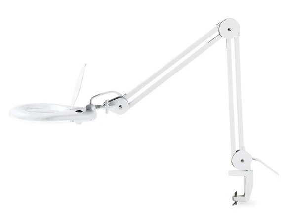 Entregada con una lente de 8 dioptrías. Su brazo articulado permite orientar la lupa en la posicion mas comoda, cuenta con 60 LEDs muy luminosos y de muy bajo consumo (8W) además de una con tapa protectora para la lente. La abrazadera incluida permite fijarla en el borde de una mesa de forma segura.